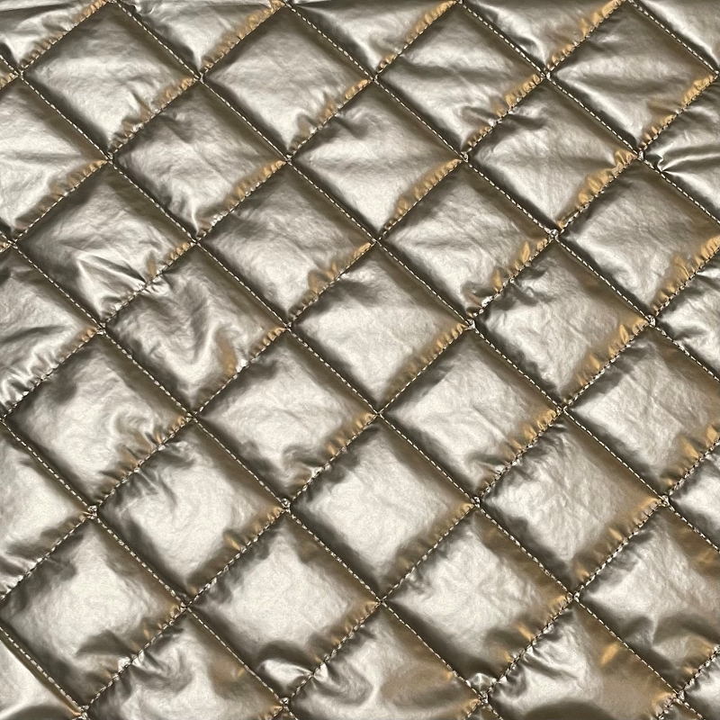 Avec ce tissu matelasse losange or brillant réalisez aussi bien des vêtements que des accessoires (sacs, pochettes) et en décoration (plaids, coussins).