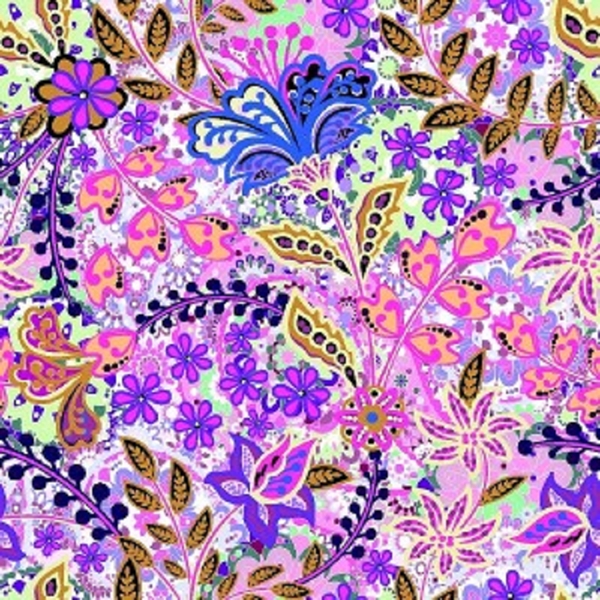 Ce tissu coton imprime fleur royal mauve représente de jolies fleurs et branchages.