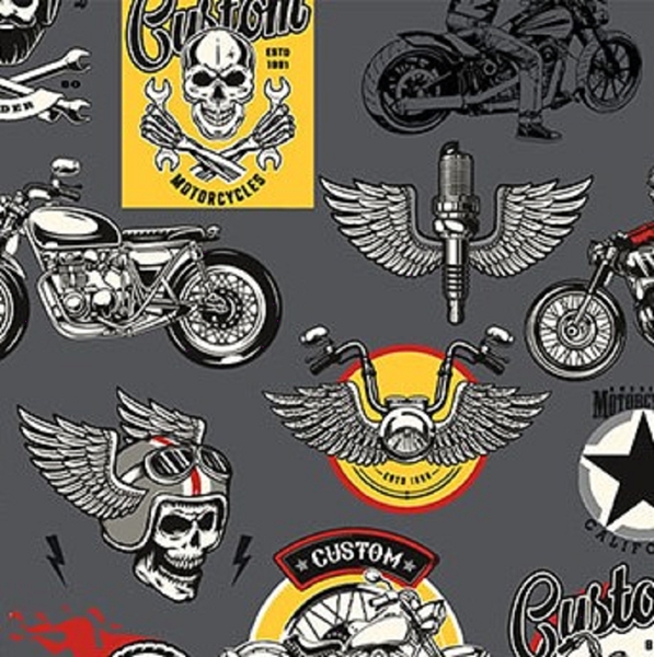 Pour les motards en herbe ou confirmés, ce tissu moto coton fond gris souple et agréable au toucher, avec ses jolis motifs de moto et ses couleurs originales vous invitera à coudre de très belles créations.