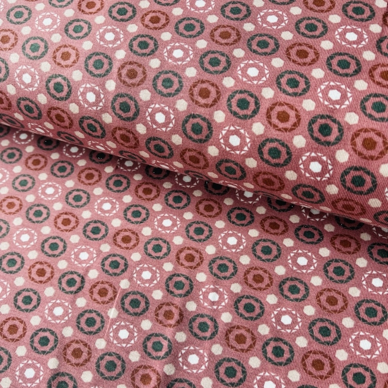 Ce tissu jersey organic graphique rose clair fera le bonheur des plus petits comme les plus grands ! Idéal pour créer de beaux vêtements personnalisés (pull, tee-shirt, short...).