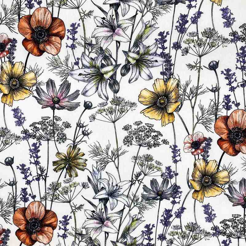 Apportez une touche de poésie florale à votre intérieur avec le Tissu Bachette Coton MFTA Adèle 280 cm, proposé par Tissu Fil et Compagnie. Son motif délicat, composé de fleurs fines et élégantes aux couleurs douces et naturelles, crée une atmosphère harmonieuse et lumineuse. Les teintes de jaune, orange, violet et rose se détachent subtilement sur un fond blanc éclatant, offrant un rendu raffiné et intemporel.
