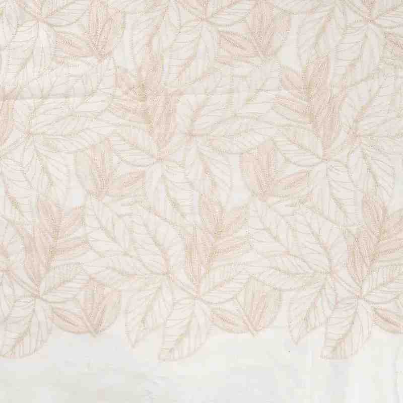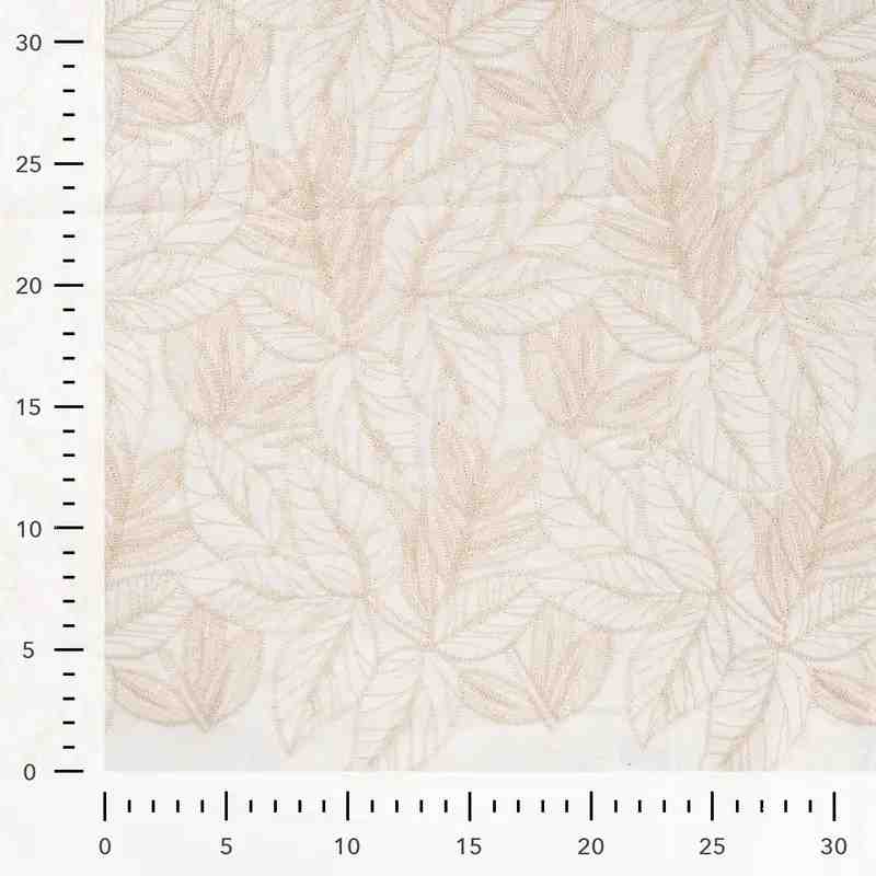 Son motif délicatement brodé, représentant de fines feuilles en ton sur ton beige, apporte un relief subtil et sophistiqué. Cette broderie minutieuse et harmonieuse crée un esprit chic, naturel et intemporel, parfait pour concevoir des pièces élégantes et lumineuses. Robes fluides, blouses raffinées, jupes aériennes, tuniques délicates ou encore accessoires décoratifs : ce tissu se prête à une multitude de créations créatives et soignées.
