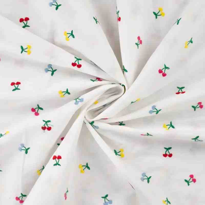 Ce tissu se distingue par ses petites cerises brodées aux couleurs variées, réparties harmonieusement sur une base blanche douce et lumineuse. Cette broderie soignée apporte une touche ludique et rafraîchissante, idéale pour des vêtements estivaux, des accessoires pleins de charme ou des pièces destinées aux enfants. Grâce à sa composition 100 % coton, le tissu est respirant, agréable au toucher et parfaitement adapté aux peaux sensibles.
