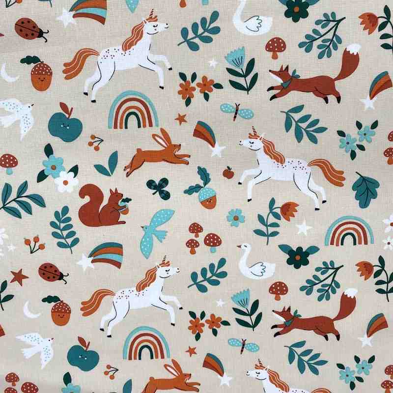 Ce tissu met en scène un univers merveilleux où licornes, renards, écureuils, oiseaux et arcs-en-ciel se mêlent harmonieusement à de jolies fleurs et feuilles sur un fond beige doux et lumineux. Les tons terracotta, vert sauge et bleu canard apportent une touche moderne et chaleureuse à l’ensemble. Ce motif enchanteur est parfait pour confectionner des accessoires, vêtements ou décorations d’inspiration nature et féerique.