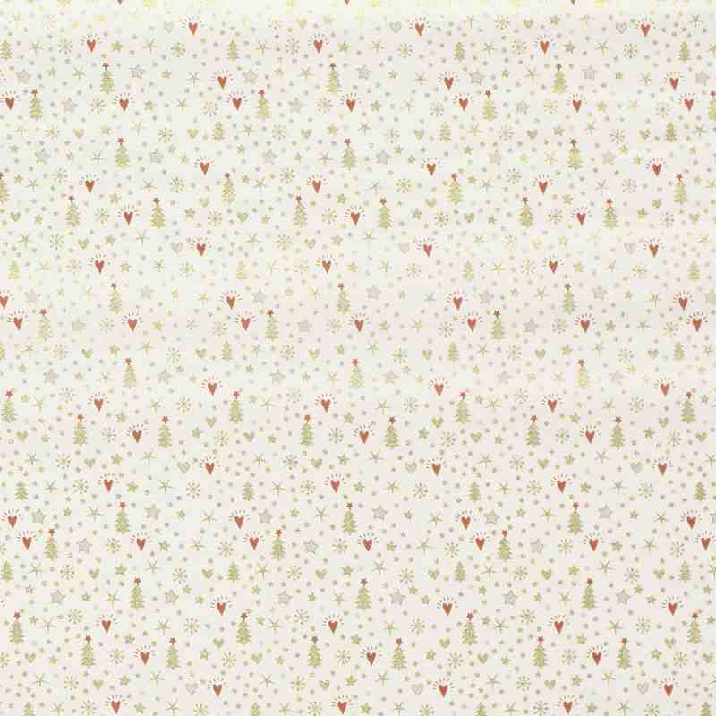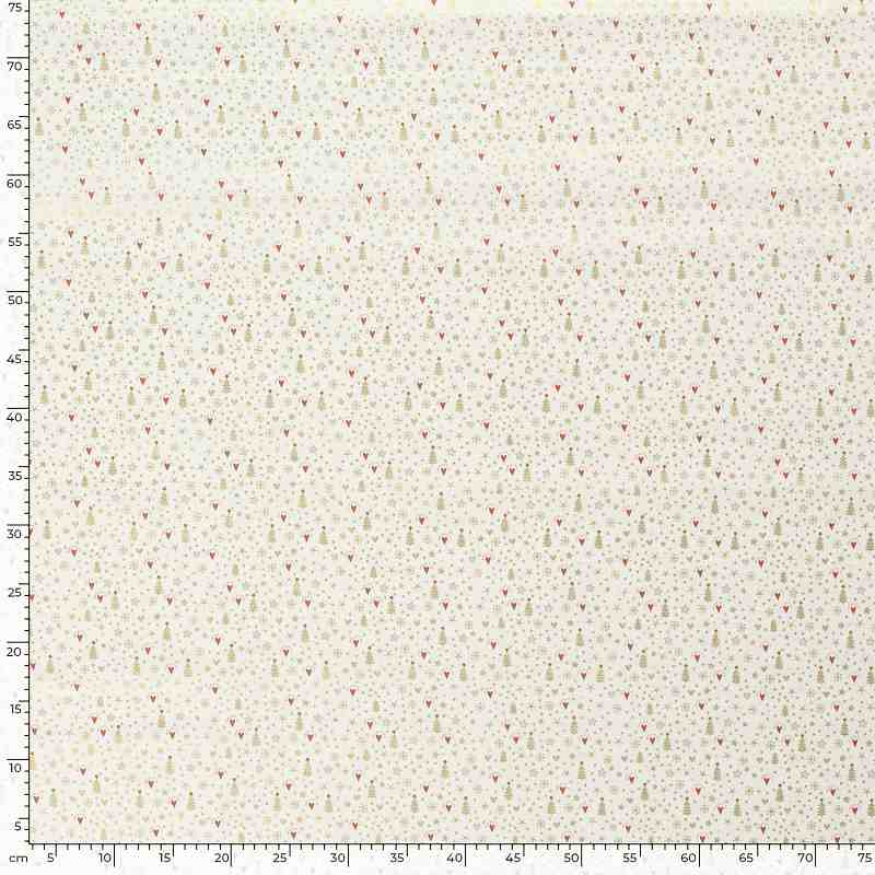 Illuminez vos projets de fin d’année avec le TISSU NOËL COTON DORÉS SAPINS & FLOCONS FOND ÉCRU, exclusivité Tissu Fil et Compagnie. Sur une base écrue douce et lumineuse, un ballet de sapins stylisés, flocons délicats, étoiles et petits cœurs se déploie en pointes dorées rehaussées de touches rouges subtiles. L’ensemble évoque la neige scintillante sous la lueur des guirlandes, pour une atmosphère chic et chaleureuse qui séduit au premier regard.