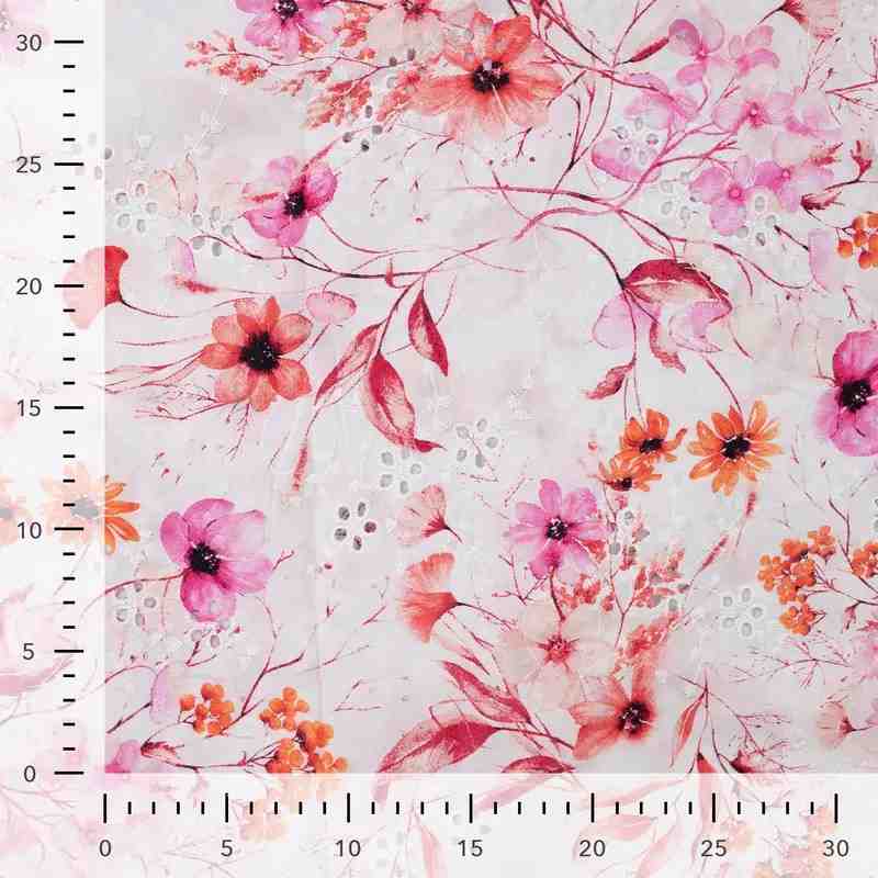 Son motif floral éclatant mêle des nuances de rose, de rouge et d’orange, créant un rendu vibrant et artistique. Les fleurs semblent peintes à l’aquarelle, donnant à ce tissu un style délicat et expressif à la fois. Les touches de broderies blanches ajourées ajoutent une dimension supplémentaire, offrant un relief subtil qui sublime votre création. Ce tissu est idéal pour coudre des robes estivales, blouses fluides, jupes légères, chemisiers élégants ou encore des accessoires tels que tote bags, bandeaux ou foulards.