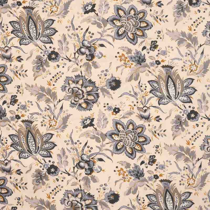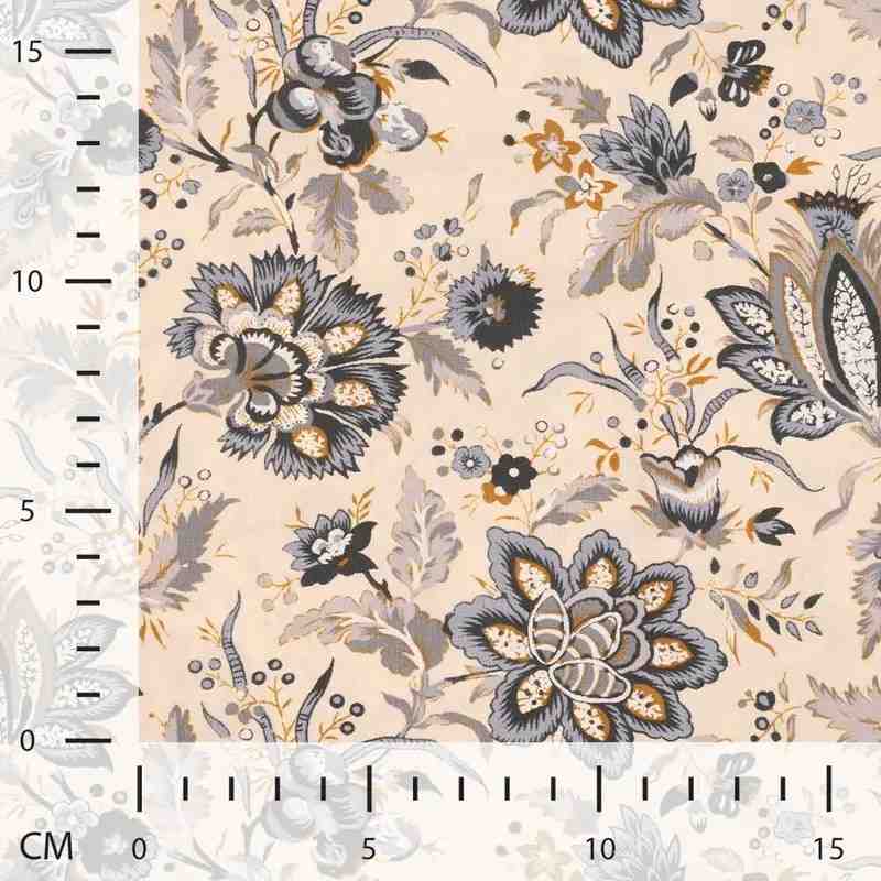 Découvrez ce superbe coton imprimé 100 % coton proposé par Tissu Fil et Compagnie, un tissu élégant au style floral travaillé, parfait pour donner du caractère à vos créations couture. Ses grandes fleurs stylisées dans des nuances de gris, de noir et de moutarde se détachent harmonieusement sur un fond beige doux, créant un motif riche, sophistiqué et intemporel.
