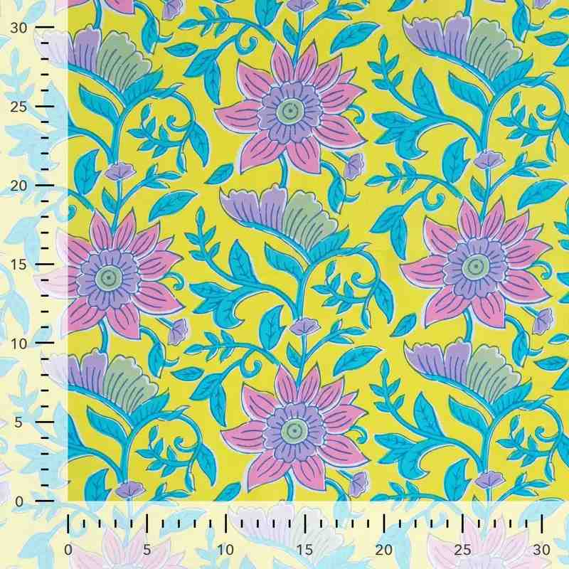 TISSU COTON IMPRIMÉ FLEURS ARABESQUES FOND JAUNE