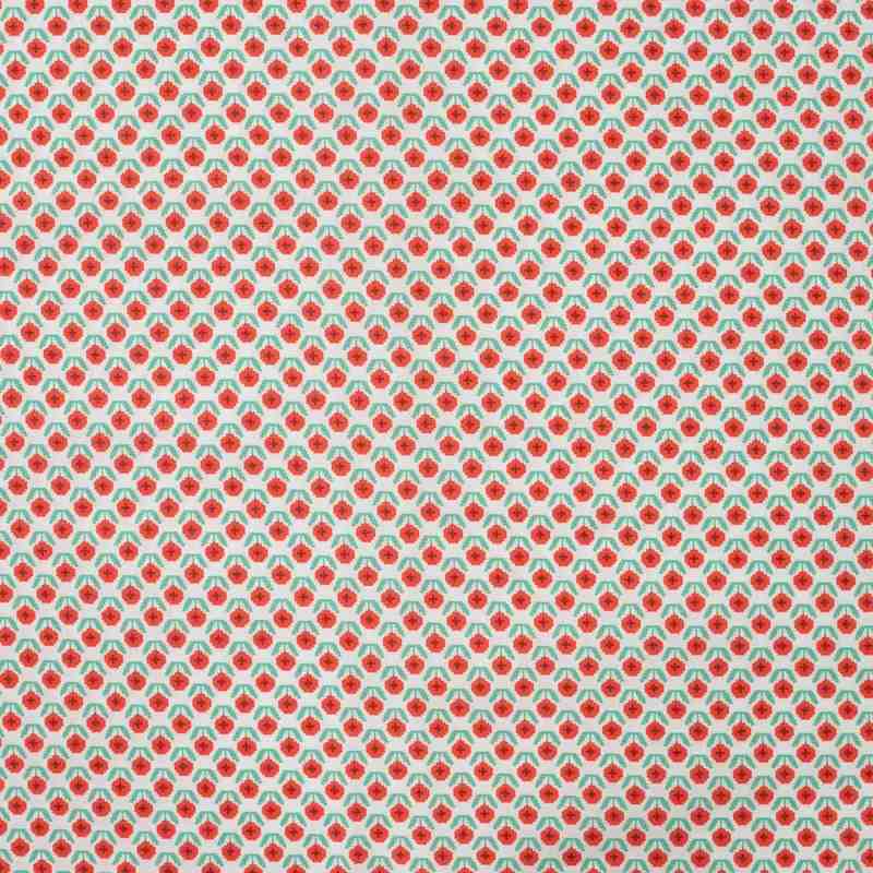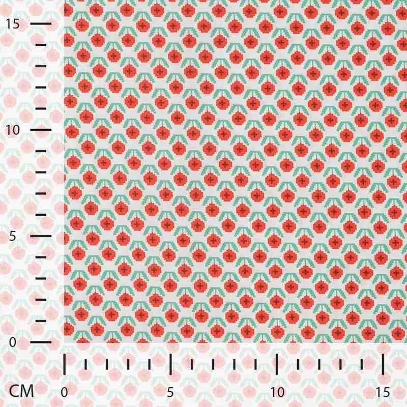 Découvrez ce ravissant coton imprimé 100 % coton proposé par Tissu Fil et Compagnie, un tissu aux motifs floraux rétro qui apportera charme et dynamisme à toutes vos créations couture. Ses petites fleurs rouges et ses touches de vert vif, organisées en motif répétitif, créent un rendu frais, joyeux et intemporel, idéal pour des projets uniques et colorés.