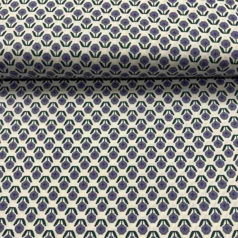 Son motif fleuri rétro, alliant des tons mauves délicats et des touches vertes profondes sur un fond naturel, évoque l’esthétique des tissus vintage tout en apportant une modernité subtile. Les petites fleurs géométriques répétées créent un visuel harmonieux et équilibré, parfait pour concevoir des pièces tendance et intemporelles. Ce tissu conviendra tout particulièrement pour des chemisiers, robes légères, jupes, accessoires de mode, foulards, trousses, tote bags ou encore pour des projets décoratifs comme des coussins et du linge de maison.