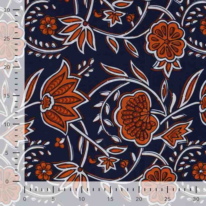 Apportez une élégance chaleureuse et un esprit artisanal à vos créations avec ce tissu coton imprimé aux superbes motifs floraux d’inspiration indienne. Son fond bleu marine profond, sublimé par des dessins floraux terracotta, écru et touches de brun, crée un contraste raffiné et intemporel. Ce tissu au caractère affirmé est idéal pour des projets couture à la fois authentiques, modernes et durables.