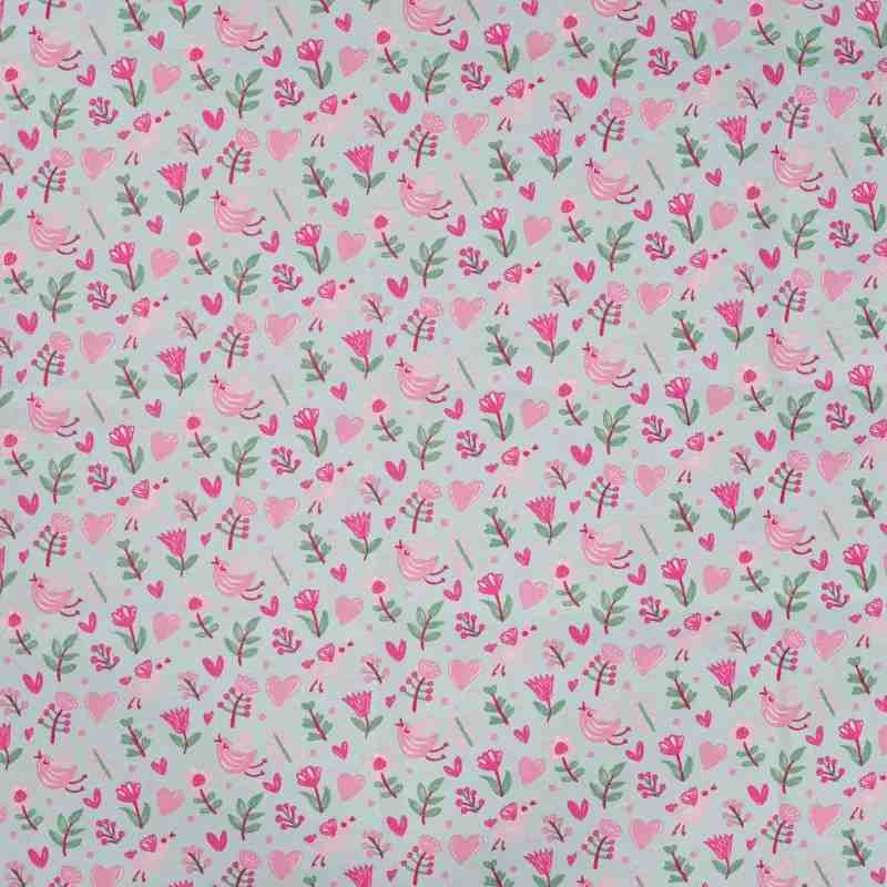 TISSU COTON IMPRIMÉ OISEAUX ET CŒURS ROSES