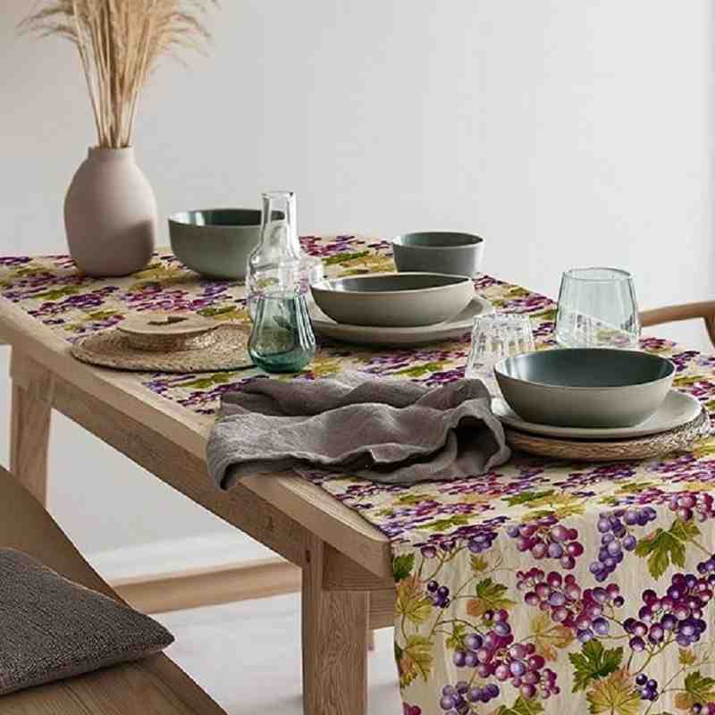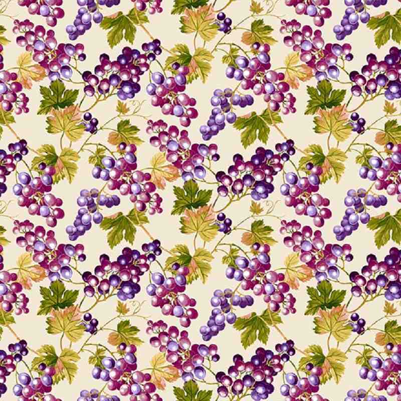 Ce tissu met à l’honneur de magnifiques grappes de raisin violet et muscat, accompagnées de feuilles de vigne finement dessinées. Sur un fond beige doux et lumineux, les nuances de pourpre, vert et doré créent une composition harmonieuse et chaleureuse. Ce motif champêtre évoque la Provence et les vendanges, idéal pour des créations à l’esprit authentique et naturel.