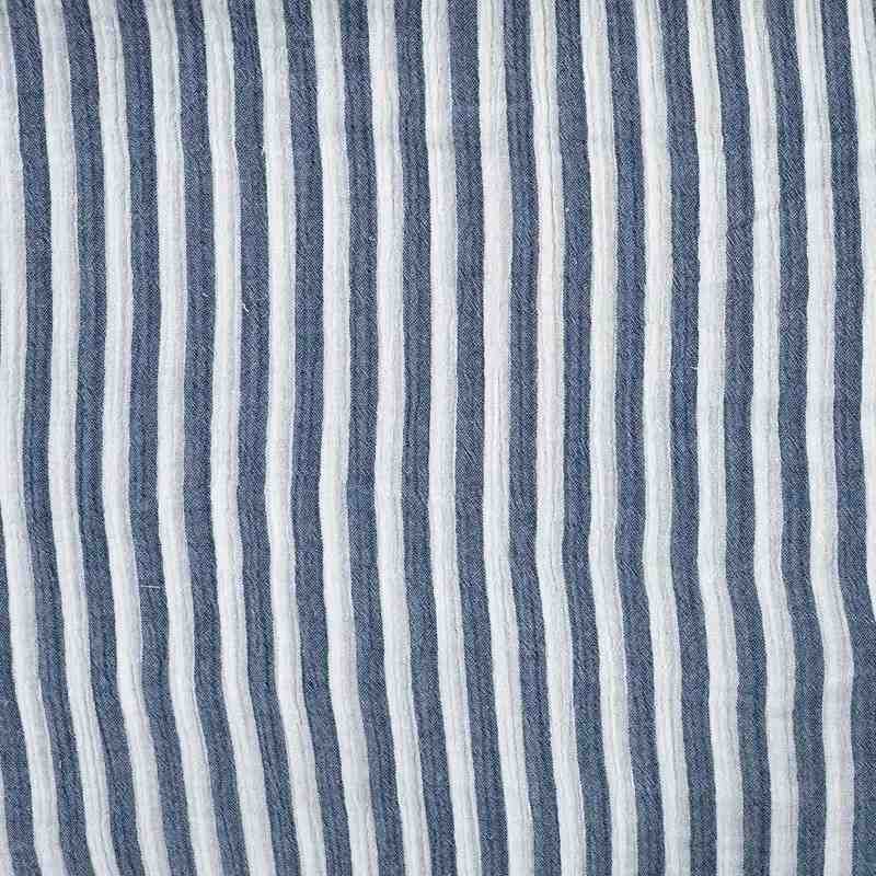 Sa texture gaufrée et aérienne, caractéristique de la gaze de coton, apporte un confort exceptionnel tout en offrant un tombé souple et naturel. Les rayures verticales bleu marine et blanc offrent un style intemporel, inspiré de l’univers marin, facile à assortir et parfait pour des créations fraîches et élégantes. Ce tissu se prête aussi bien à des looks décontractés qu’à des tenues sophistiquées grâce à son charme simple et raffiné.