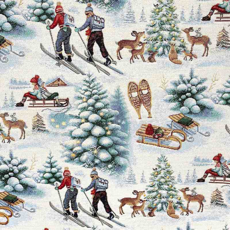 Ce tissu met en scène un magnifique paysage de montagne enneigé : des skieurs, des luges, des sapins couverts de neige et des animaux des bois composent un décor chaleureux et féérique. Les détails fins et les couleurs douces – bleu glacier, vert sapin, brun et blanc – créent une atmosphère authentique et réconfortante, parfaite pour les décorations de Noël ou d’hiver. Ce motif intemporel évoque la convivialité et la beauté des vacances à la montagne.