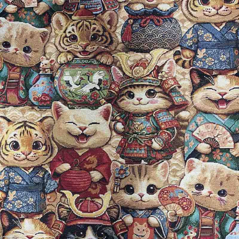 Laissez-vous séduire par ce tissu jacquard à motifs de chats japonais, à la fois raffiné, original et riche en détails. Inspiré de l’univers traditionnel japonais, il met en scène de charmants chats vêtus de tenues inspirées des samouraïs et du folklore nippon, dans une palette chaleureuse de beiges, rouges, bleus et verts. Sélectionné avec soin par Tissu Fil et Compagnie, ce tissu est idéal pour des créations uniques au caractère affirmé.