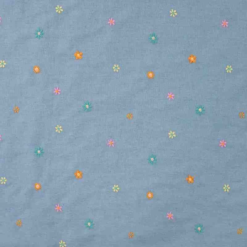 TISSU JEAN BLEU BRODERIE FLEUR MULTI