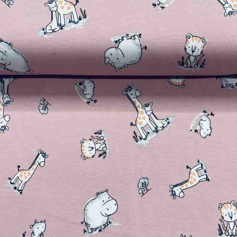 TISSU JERSEY COTON ANIMAUX SAVANE FOND ROSE