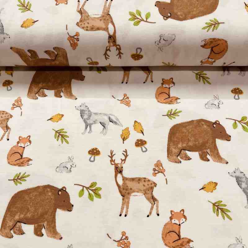 Son motif représente de magnifiques animaux de la forêt tels que ours, renards, loups, lapins et cerfs, illustrés dans des tons naturels chauds et apaisants. Des feuilles, champignons et glands complètent ce décor automnal inspiré de la nature. Ce design tendre et harmonieux est parfait pour confectionner des vêtements du quotidien : t-shirts, leggings, pyjamas, robes, bodies pour bébé, snoods, gigoteuses et accessoires décoratifs.