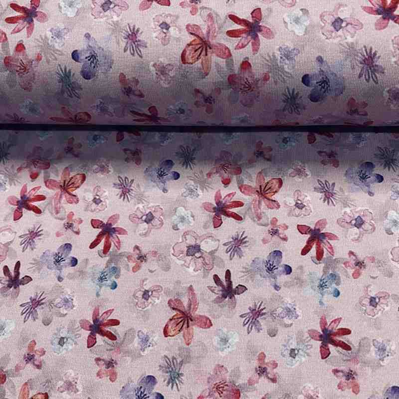 Son motif floral aquarellé, décliné dans des nuances de rose, violet, mauve et touches de rouge, apporte une atmosphère poétique et élégante. Le fond rose pâle renforce la douceur du design, créant un tissu féminin, délicat et très tendance. Ce jersey est parfait pour la confection de t-shirts, robes légères, leggings, jupes, pyjamas, bodies pour bébé, snoods, turbulettes et accessoires textiles.