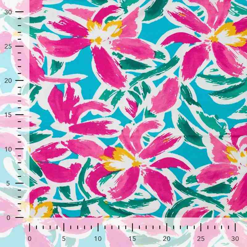 Laissez-vous séduire par ce tissu jersey viscose floral fuchsia et turquoise, parfait pour donner vie à des créations modernes, colorées et confortables. Un incontournable pour un dressing créatif et lumineux.