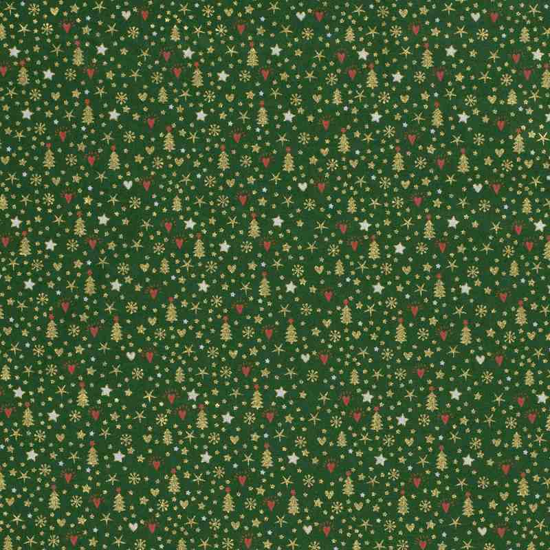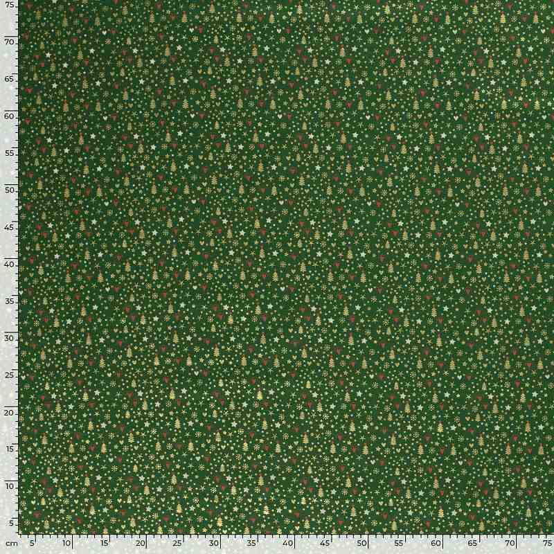 TISSU NOËL COTON DORÉS SAPINS & FLOCONS FOND VERT
