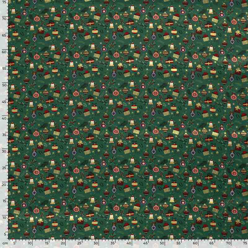 Plongez dans la magie des fêtes avec notre tissu coton de Noël Cadeaux et Ornements Vert Sapin proposé par Tissu Fil et Compagnie. Imprimé sur une base 100 % coton douce et robuste, ce motif riche en détails met en scène paquets scintillants, boules anciennes, cloches dorées et branches de pin soulignées de petites étoiles, le tout sur un vert intense rappelant le feuillage du sapin traditionnel. Grâce à son toucher agréable et à son tissage régulier, il se coud avec facilité, que vous travailliez à la main ou à la machine, même pour un premier projet.