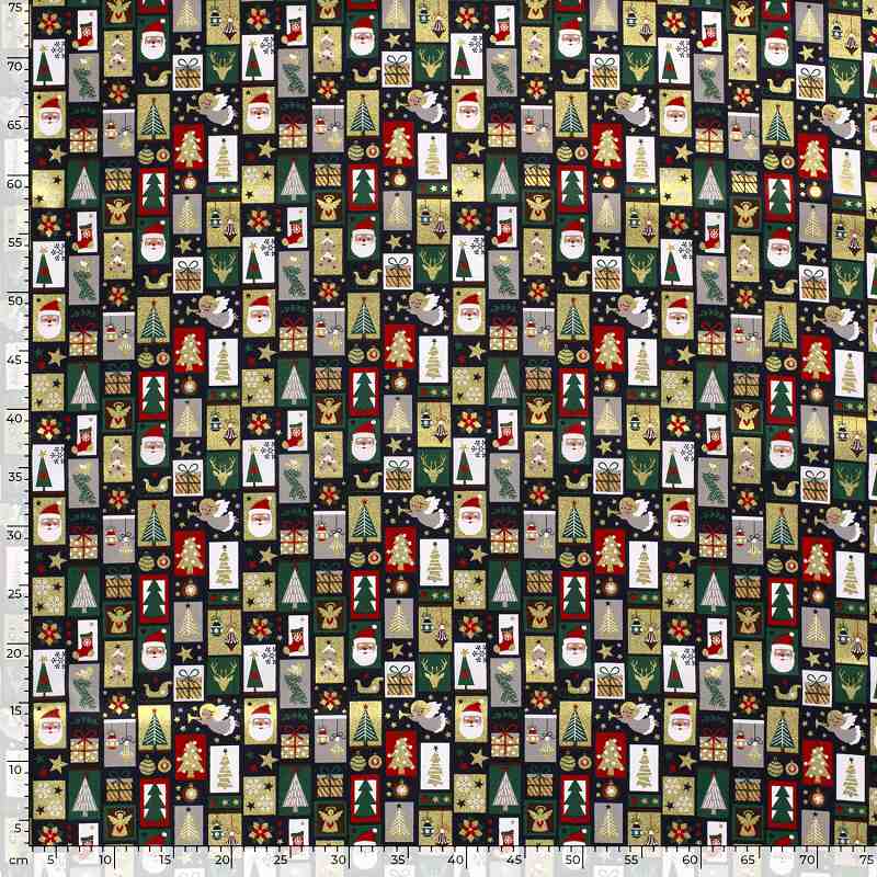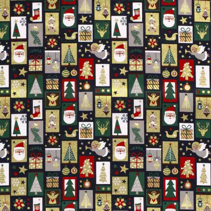 Offrez à vos créations une atmosphère féérique avec le TISSU NOËL COTON PATCHWORK ICÔNES DORÉES FOND BLEU NUIT, exclusivité Tissu Fil et Compagnie. Son imprimé mosaïque associe rectangles rouges, verts et gris autour d’un fond bleu profond, chacun renfermant un symbole emblématique : visage de Père Noël, sapins scintillants, cadeaux noués, angelots, flocons, rennes et boules rétro. Des éclats or métallisé illuminent chaque vignette, captant la lumière pour un rendu chic et chaleureux immédiatement reconnaissable.