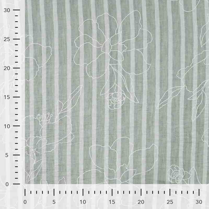 TISSU LIGNES RAYÉ FLOQUAGE FLORALE VERT SAUGE ECRU