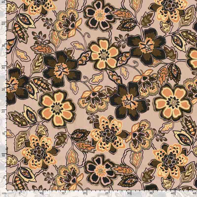 TISSU POLYESTER SATIN IMPRIMÉ FLORAL NUDE ET AMBRE
