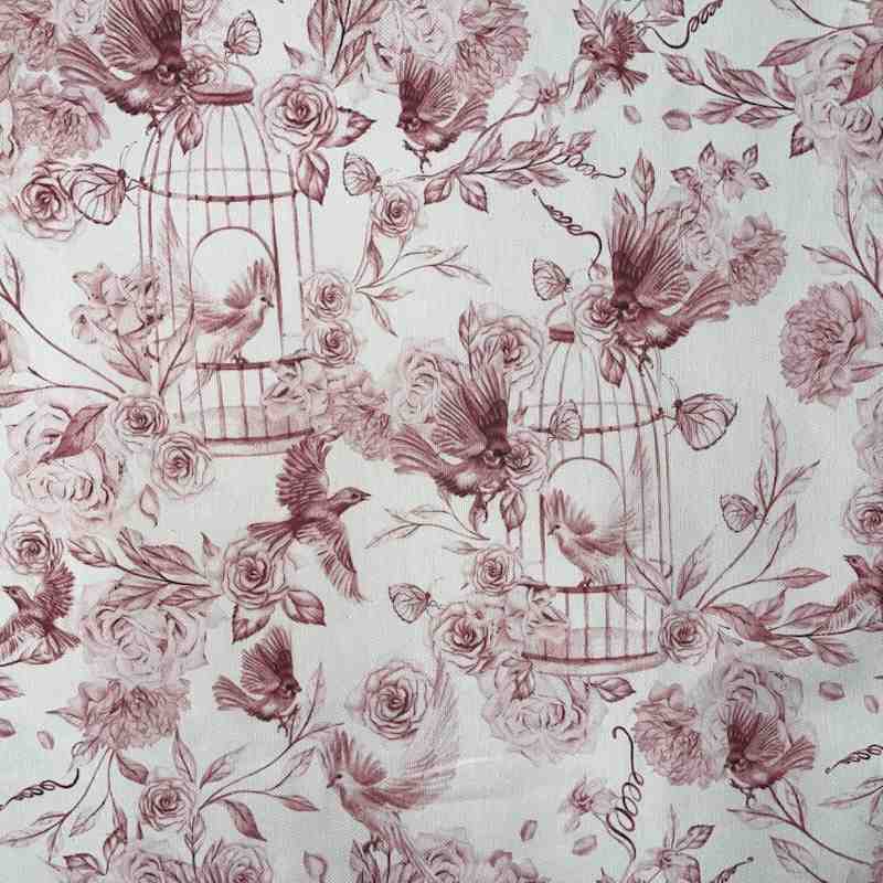 La Toile Imprimée La Cage aux Oiseaux Rose, proposée par Tissu Fil et Compagnie, est un tissu au charme romantique, idéal pour créer une ambiance douce et élégante. Ses motifs dessinés en nuances de rose représentent des oiseaux en plein envol, des cages anciennes, des fleurs délicates et des arabesques fines. L’ensemble forme une composition harmonieuse et pleine de poésie, parfaite pour apporter une atmosphère chaleureuse et délicate à vos projets de décoration.