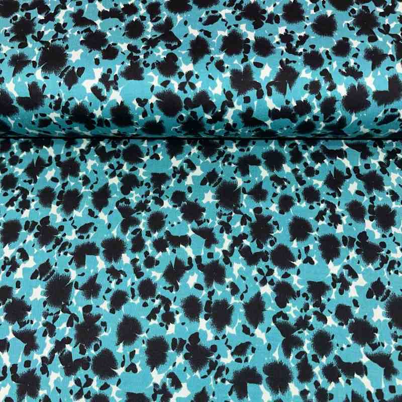 Son motif éclat turquoise, mêlant des touches noires et blanches, offre un rendu dynamique et contemporain. L’effet tacheté évoque une impression artistique, idéale pour concevoir des pièces originales et tendance. Ce tissu est parfait pour des vêtements du quotidien comme des blouses, tops légers, jupes fluides, robes modernes ou pantalons souples. Il s’adapte aussi très bien à la réalisation d’accessoires tels que bandeaux, foulards ou pochettes, et peut même être utilisé en décoration intérieure pour ajouter une note de fraîcheur colorée.