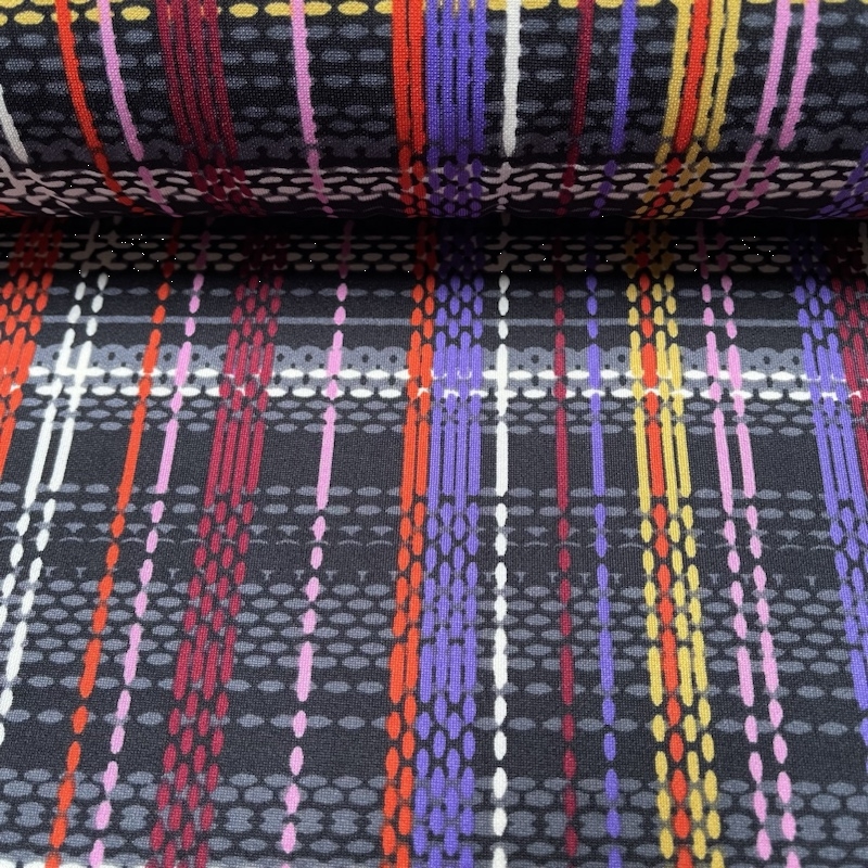 Ce tissu scuba imprime rayure multi fond gris vous permettra de réaliser toutes vos créations de vêtements combinaison, robe, tee shirt, jupe, pantalon et veste à associer.