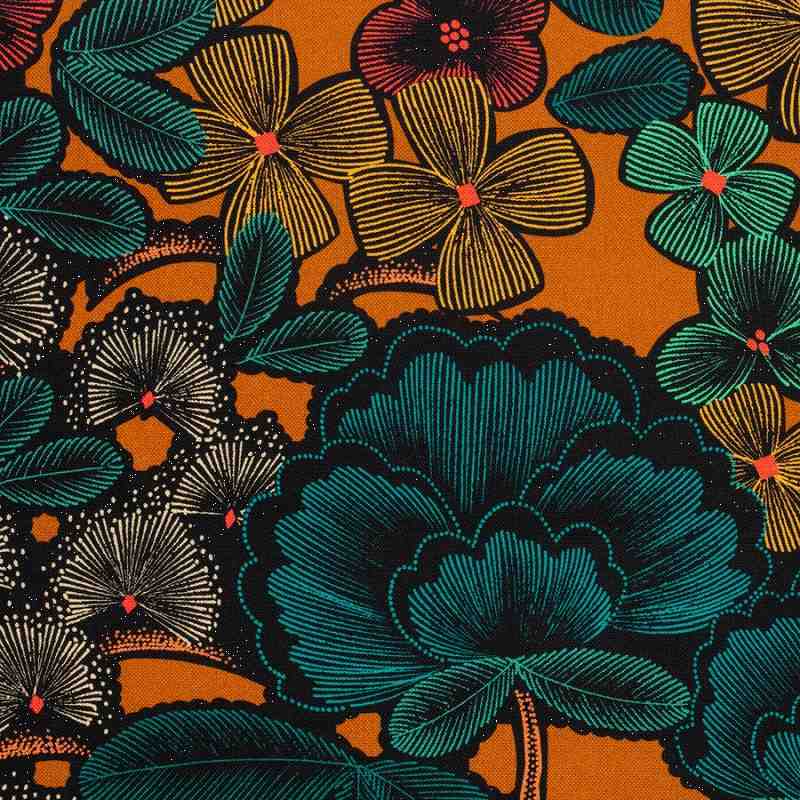 Apportez chaleur et élégance à votre intérieur avec le tissu Thévenon Kew Gardens fond caramel. Inspiré de la nature luxuriante et des jardins botaniques, ce tissu d’ameublement se distingue par son motif floral graphique aux lignes finement dessinées et ses couleurs profondes et raffinées. Son fond caramel chaleureux met parfaitement en valeur les feuillages turquoise, les fleurs dorées et les touches de noir, créant une atmosphère chic et contemporaine.