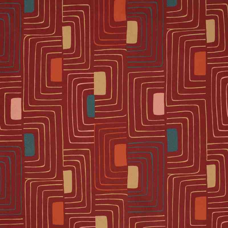 Apportez une touche de caractère et d’élégance à votre intérieur avec le tissu Thévenon Nefertiti fond rouge. Ce tissu d’ameublement séduit par son motif géométrique graphique aux lignes modernes et structurées, inspiré du design rétro chic. Son fond rouge profond, sublimé par des touches d’ocre, de beige, de bleu et de brique, crée une atmosphère chaleureuse et sophistiquée, idéale pour une décoration pleine de personnalité.