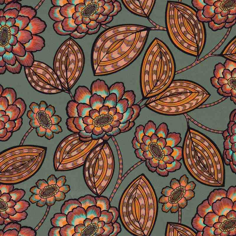Laissez-vous séduire par la toile Aline de la Maison Thévenon, une véritable œuvre d’art textile qui allie un charme rétro-chic à une robustesse contemporaine. Ce tissu, reconnaissable entre mille, arbore des motifs floraux généreux et stylisés, inspirés d’un jardin imaginaire où les teintes chaudes (terracotta, ambre, turquoise) dansent sur un fond vert sauge profond et apaisant.