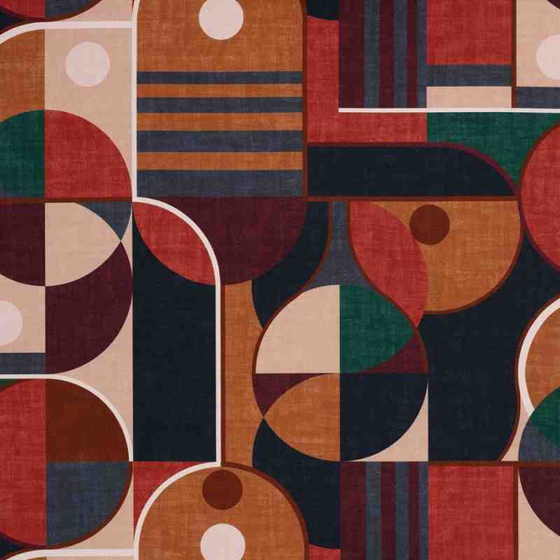 Le Motif Géométrique (Art Déco / Bauhaus) : Un jeu audacieux de cercles et de formes structurées dans une palette de rouge brique, vert forêt, bleu nuit et ocre. Parfait pour apporter une touche rétro-chic et du caractère à une pièce.