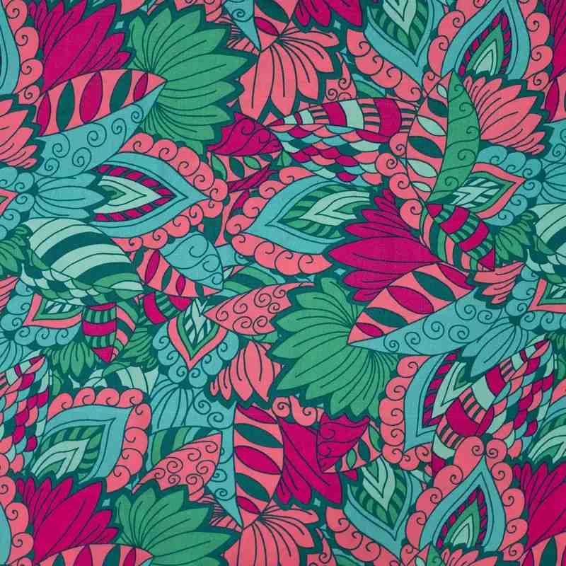 Apportez une touche d’exotisme et de modernité à vos créations avec ce tissu viscose imprimé, soigneusement sélectionné par Tissu Fil et Compagnie. Son motif feuillage dense et stylisé, mêlant des nuances harmonieuses de vert, rose, fuchsia et turquoise, crée un rendu dynamique et audacieux, parfait pour des projets couture originaux et pleins de caractère.