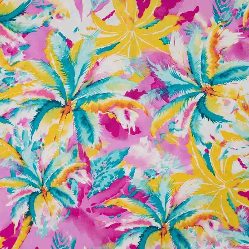Apportez une ambiance estivale et exotique à vos créations avec ce tissu viscose imprimé, soigneusement sélectionné par Tissu Fil et Compagnie. Son motif de palmiers tropicaux aux couleurs éclatantes – rose, jaune, turquoise et touches de vert – évoque immédiatement le soleil, les vacances et l’évasion. Ce tissu est idéal pour réaliser des pièces lumineuses, modernes et pleines de fraîcheur.