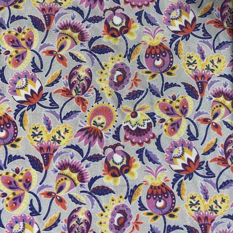 Laissez-vous séduire par le charme vibrant et bohème de ce tissu viscose India violet, proposé par Tissu Fil et Compagnie. Inspiré des motifs floraux traditionnels indiens, ce tissu met en scène une profusion de fleurs stylisées dans des tons de violet, jaune, rouge, rose et bleu sur un fond clair, pour un rendu lumineux, vivant et raffiné.