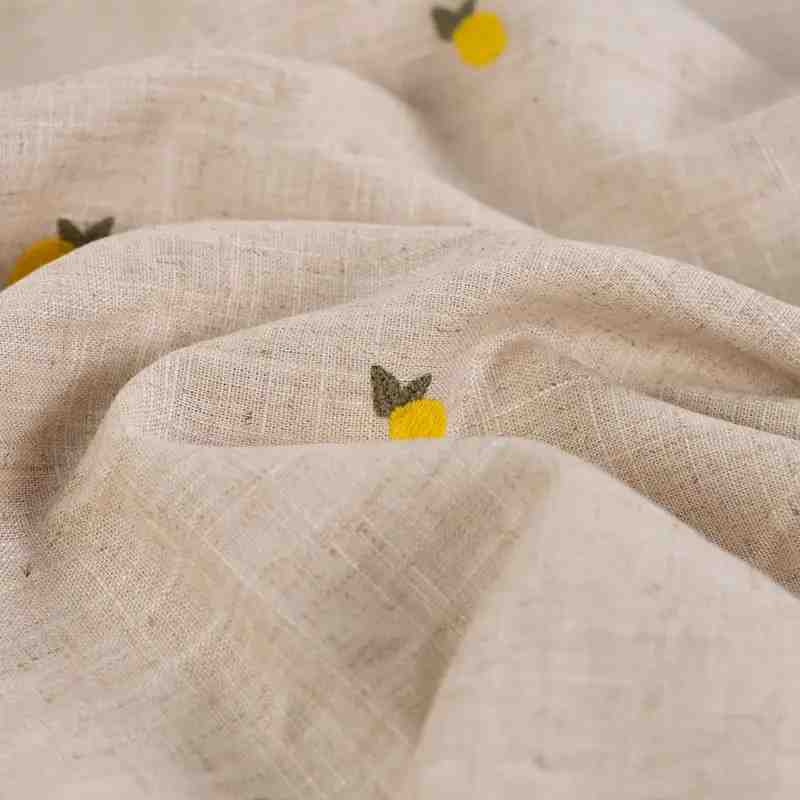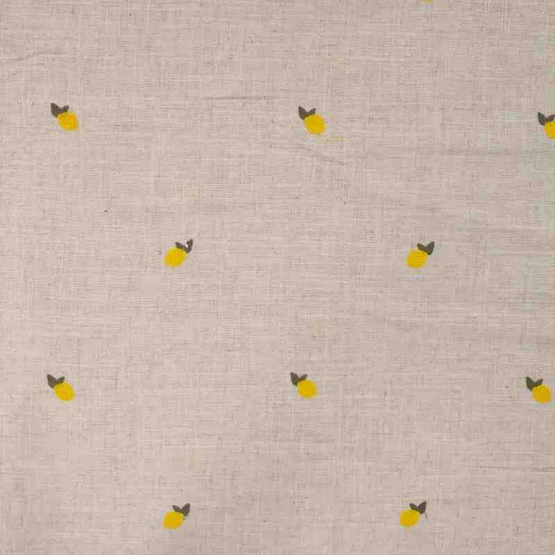 Ce tissu se distingue par de délicates petites broderies citron réparties sur une base naturelle légèrement texturée. Ce motif apporte une touche pétillante et moderne, parfaite pour créer des pièces uniques au style ensoleillé. La viscose confère au tissu une grande souplesse, un toucher très doux et un excellent confort, tandis que le lin assure une résistance optimale, une sensation de fraîcheur et un aspect naturellement chic.