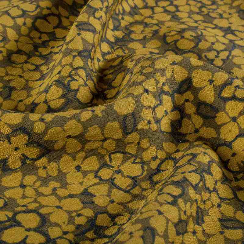 Adoptez ce tissu viscose-polyamide imprimé floral moutarde et kaki pour donner vie à des créations uniques, confortables et irrésistiblement tendance.