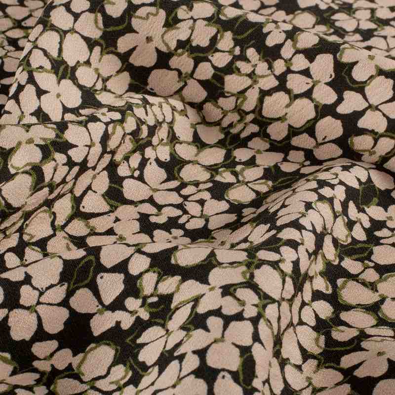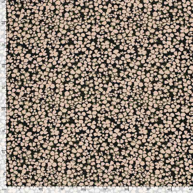 Offrez à vos créations une note graphique raffinée avec ce tissu viscose-ottoman imprimé floral Noir Rose de Tissu Fil et Compagnie. Sur un fond noir profond, des pétales blush s’épanouissent en all-over, soulignés d’un trait vert olive discret qui rappelle la fraîcheur du feuillage printanier. Le micro-motif, élégant de près comme de loin, flatte toutes les silhouettes sans surcharge visuelle et invite à des associations chics avec du beige, du kaki ou un uni noir.