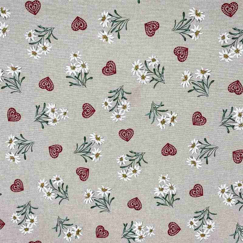 Ce tissu met à l’honneur les fleurs d’edelweiss blanches, symbole de pureté et de nature, associées à de jolis cœurs rouges décoratifs. Sur un fond beige effet lin naturel, l’ensemble évoque la douceur des ambiances de montagne et des chalets traditionnels. Ce motif intemporel apporte une note de romantisme et de fraîcheur à vos réalisations, tout en restant sobre et élégant.