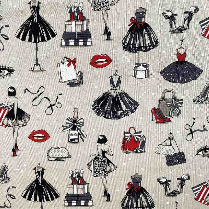 Le motif Frou Frou met en scène un univers inspiré de la haute couture : robes élégantes, talons aiguilles, sacs à main, rubans et accessoires de mode, le tout dans une harmonie de tons beige, noir, rouge et gris. Les détails soignés et le fond effet lin apportent une touche d’élégance intemporelle, parfaite pour sublimer votre intérieur ou vos créations couture. Ce tissu plaira particulièrement aux passionnés de mode et de décoration chic.